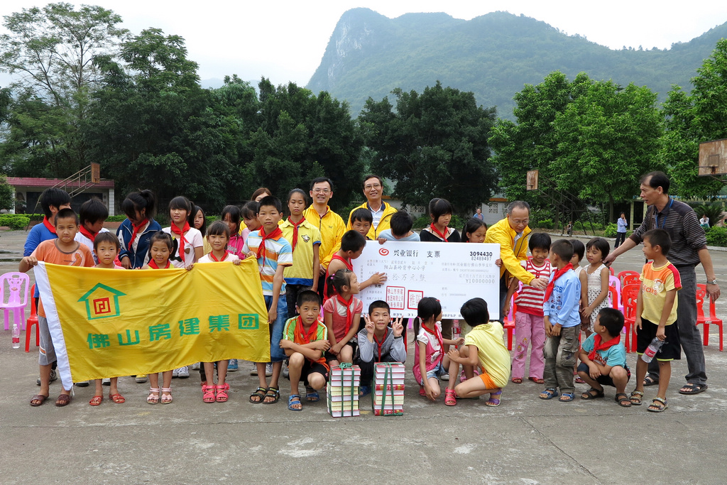 当天上午,在党委书记、董事长陈雅同志的带领下,服务队来到阳山县岭背中心小学,代表房建集团向学校送上了10万元助学慰问金和4700多元工具书及少儿读物,为山区小学师生送去了房建集团全体员工的爱心。在捐赠仪式上,陈雅同志向师生们致以节日的问候并鼓励同学们好好学习,报效祖国,传递爱心。阳山县政协黄副主席和岭背镇谭镇长及学校校长代表当地政府和全体师生对佛山房建集团有限公司爱心助学的善举表示衷心感谢!此次扶贫助学活动同时受到了当地新闻媒体的关注,阳山电视台当晚播报了活动新闻。
