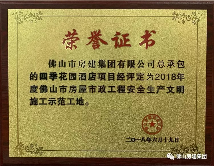 #喜讯# 我司被评为“2018年度佛山市优秀施工企业”。我司总承包的四季花园酒店项目被评为“2018年度佛山市房屋市政工程安全生产文明施工示范工地”。
