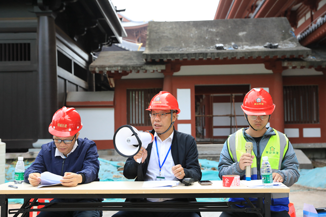 此次演练共模拟了两个情景,一为施工人员在宿舍区内违规私拉乱接电线,外出时未拔除用电设备,电线过热引起火灾;二为针对仁寿寺多为木结构建筑的项目特点,模拟现场油漆作业人员在殿内作业时不小心引燃周边物品引发火灾。
